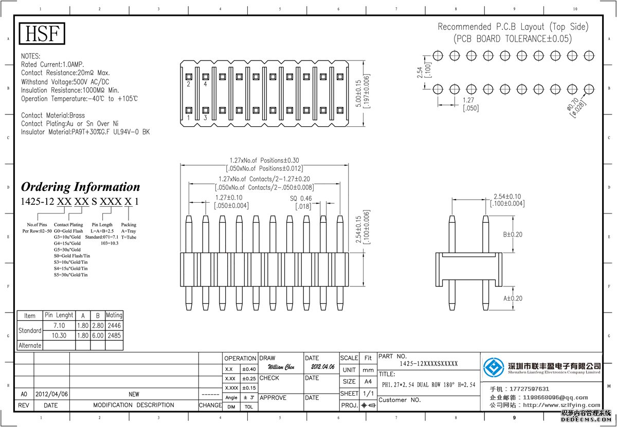 產品分類: 排針連接器 產品規(guī)格:HF 1.27*2.54 單層雙排 直針 排針 技術參數(shù):額定電流:1.0amp電流電阻:20m最大絕緣電阻:1000m承受電壓:AC 500V /分鐘工作溫度:40﹣℃+ 105℃接觸材料: