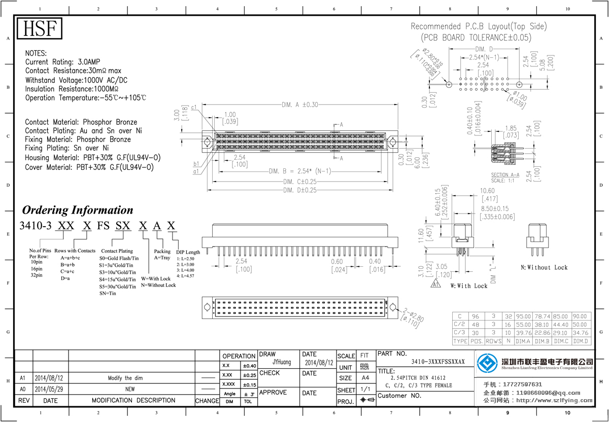 產品分類:DIN 41612連接器 產品型號:聯豐盈 2.54間距 180 直插 母座 3-16P DIN41612 技術參數:額定電流:3.0amp電流電阻:30m最大耐壓:1000V的交流/直流絕緣電阻:1000分鐘操作溫度:55﹣℃