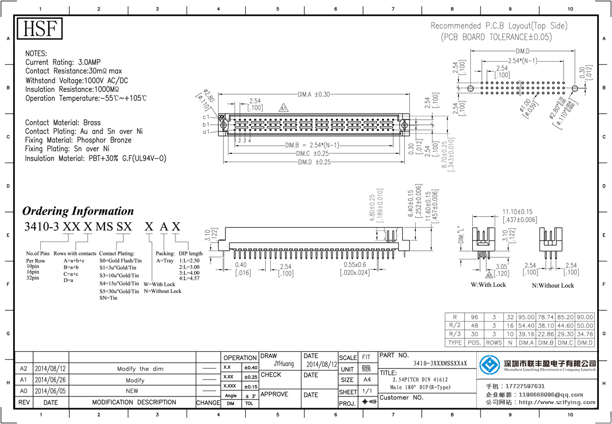 產(chǎn)品分類:DIN 41612連接器 產(chǎn)品型號:聯(lián)豐盈 DIN41612 3*32p 180 插板 板對板 連接器 定制 技術(shù)參數(shù):額定電流:3.0amp電流電阻:30m最大耐壓:1000V的交流/直流絕緣電阻:1000分鐘操作溫度: