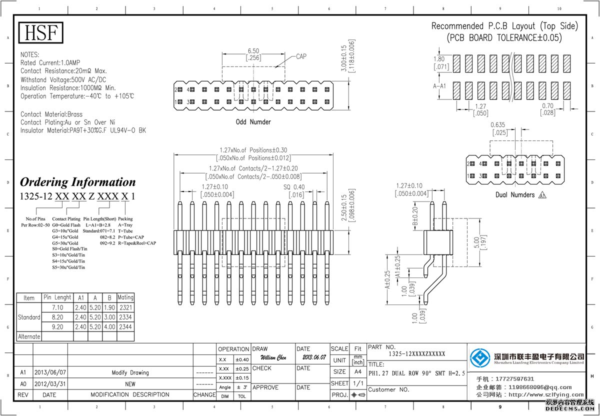 產品分類:排針連接器 產品規(guī)格:聯(lián)豐盈 1.27MM 單層雙排 90貼片式(Type A) 排針 產品介紹:額定電流:1.0amp電流電阻:20m最大絕緣電阻:1000m民承受電壓:AC 500V /分鐘工作溫度:40﹣℃+