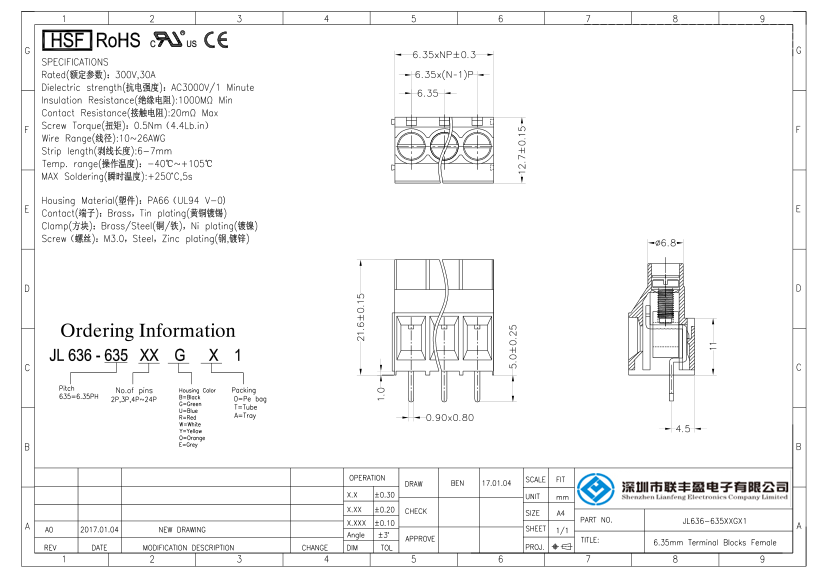 產(chǎn)品分類:接線端子 產(chǎn)品型號(hào):螺釘式PCB接線端子 間距6.35mm 詳細(xì)型號(hào):螺釘式PCB接線端子-JL636,間距6.35mm,CE認(rèn)證,UL證書 產(chǎn)品介紹:材質(zhì)電鍍(MATERIAL) , 螺絲(Screw)M2.0,鋼,鍍鋅