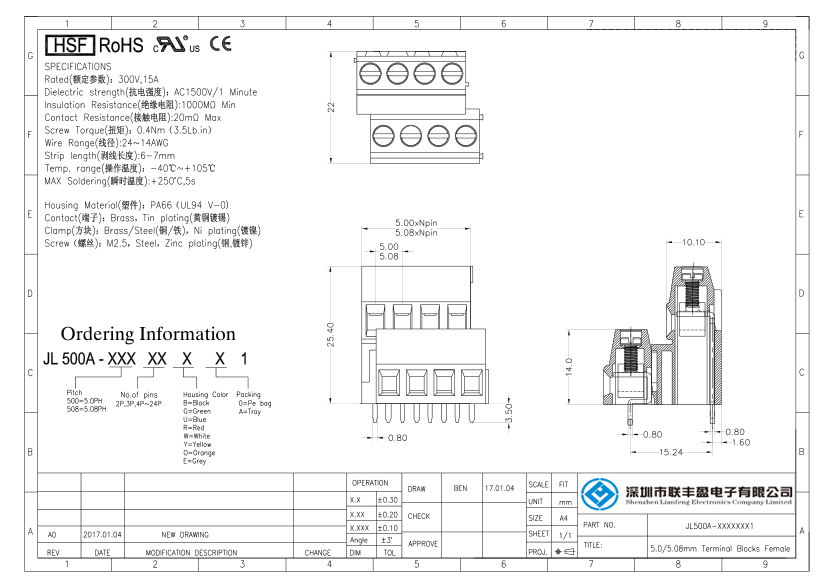產(chǎn)品分類:接線端子 產(chǎn)品型號(hào):螺釘式PCB接線端子 間距5.00/5.08mm 詳細(xì)型號(hào):螺釘式PCB接線端子-JL500A,間距5.00/5.08mm,CE認(rèn)證,UL證書 產(chǎn)品介紹:材質(zhì)電鍍(MATERIAL) , 螺絲(Screw)M2.0,鋼