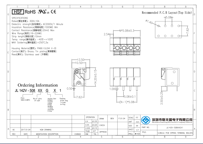 產(chǎn)品分類:接線端子 產(chǎn)品型號:彈簧式PCB端子 5.08/7.5/7.62mm 詳細(xì)型號:彈簧式PCB接線端子-JL142V,間距5.08/7.5/7.62mm,CE認(rèn)證,UL證書 產(chǎn)品介紹:材質(zhì)電鍍(MATERIAL) , 彈片(Reed)不銹鋼Stai