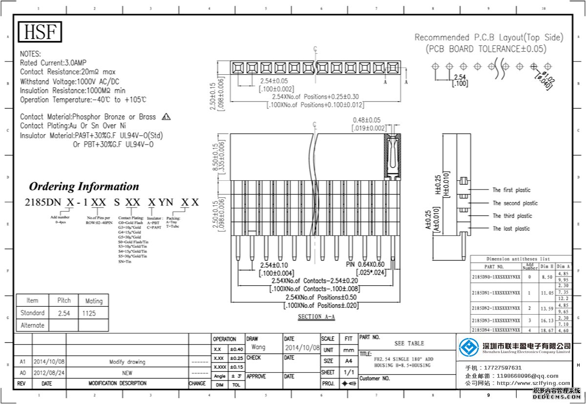 產(chǎn)品分類:排母連接器 產(chǎn)品規(guī)格:2.54MM H=8.5MM 單排 加高四層塑膠 排母 聯(lián)豐盈 產(chǎn)品介紹:額定電流:3.0amp電流電阻:20m最大絕緣電阻:1000mmin耐壓:1000V AC /分鐘工作溫度:40﹣℃+ 105℃