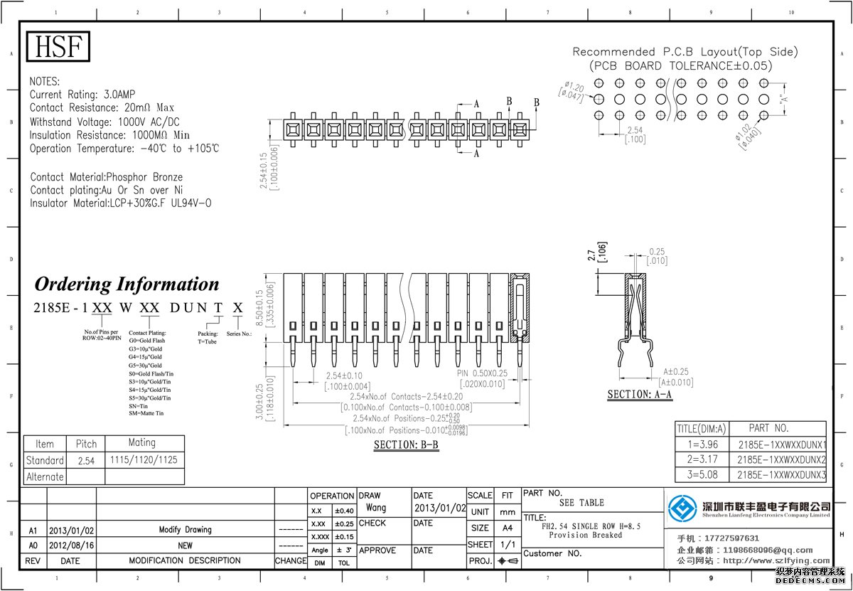 產(chǎn)品分類:排母連接器 產(chǎn)品規(guī)格:2.54MM H=8.5MM 單排 蜈蚣腳排母 廠家 聯(lián)豐盈 產(chǎn)品介紹:額定電流:3.0amp電流電阻:20m最大絕緣電阻:1000mmin耐壓:1000V AC /分鐘工作溫度:40﹣℃+ 105℃接