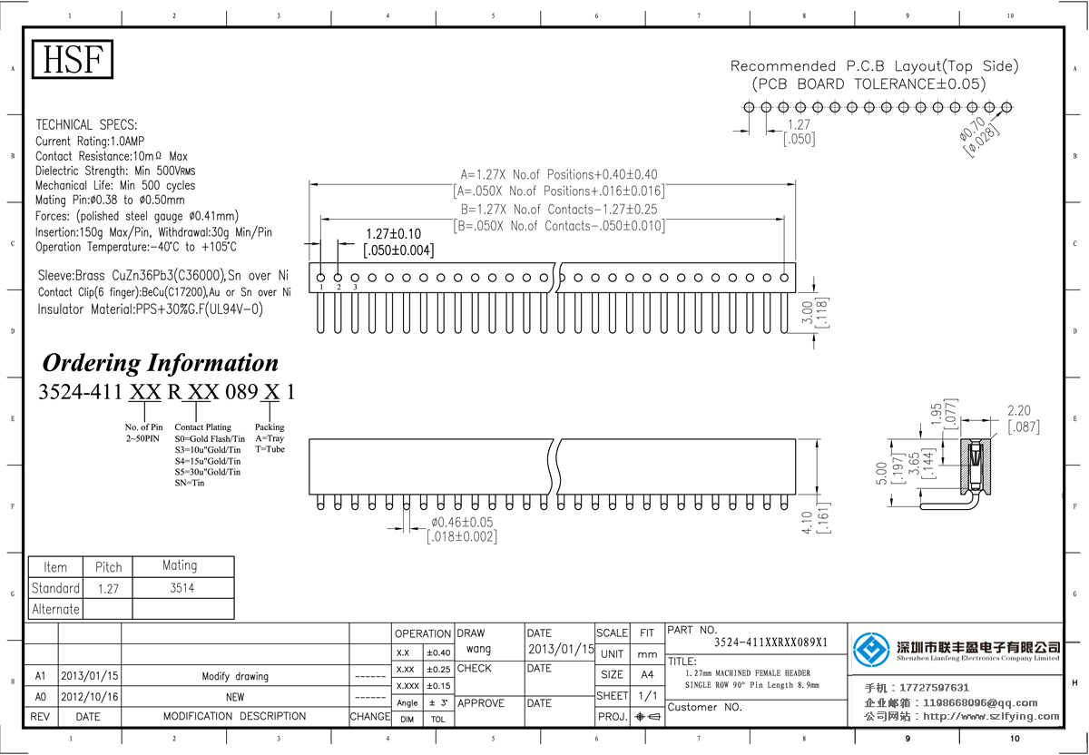 產(chǎn)品分類:圓孔排針排母連接器 產(chǎn)品型號:1.27MM 單排 4爪型 圓孔排母 批發(fā) 廠家 技術(shù)參數(shù):額定電流:1.0amp接觸電阻:10m0 Max Dielectric強(qiáng)度:MIN 500vrm5機(jī)械壽命:最少500次交配銷:0.380.