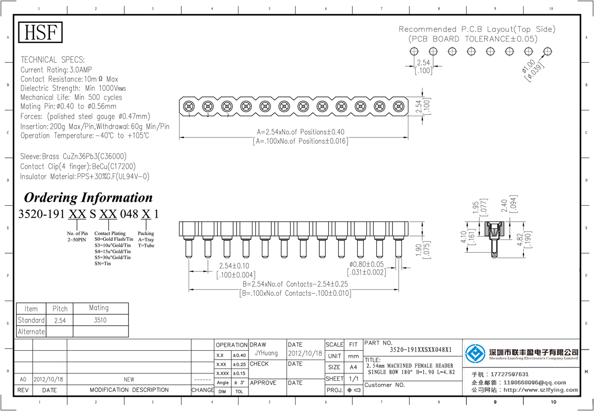 產品分類:圓孔排針排母連接器 產品型號:聯豐盈 2.54MM H=1.9 單排 直插型 圓型排針 技術參數:1.oamp接觸電阻:LOM最大介電強度:MIN 1000vrms機械壽命:500分鐘周期運行溫度:40℃+ 105℃套