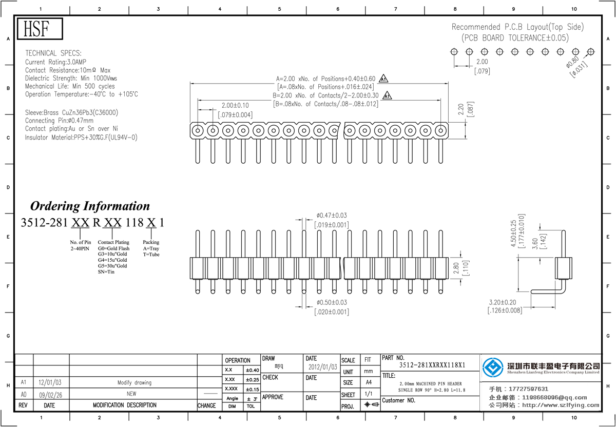 產(chǎn)品分類:圓孔排針排母連接器 產(chǎn)品型號(hào):聯(lián)豐盈 2.0MM 單排 H=2.8 S/T 圓型排針 技術(shù)參數(shù):3.oamp接觸電阻:10mMax Dielectric強(qiáng)度:MIN1000vrms機(jī)械壽命:500分鐘周期運(yùn)行溫度:40℃+ 105℃套:黃