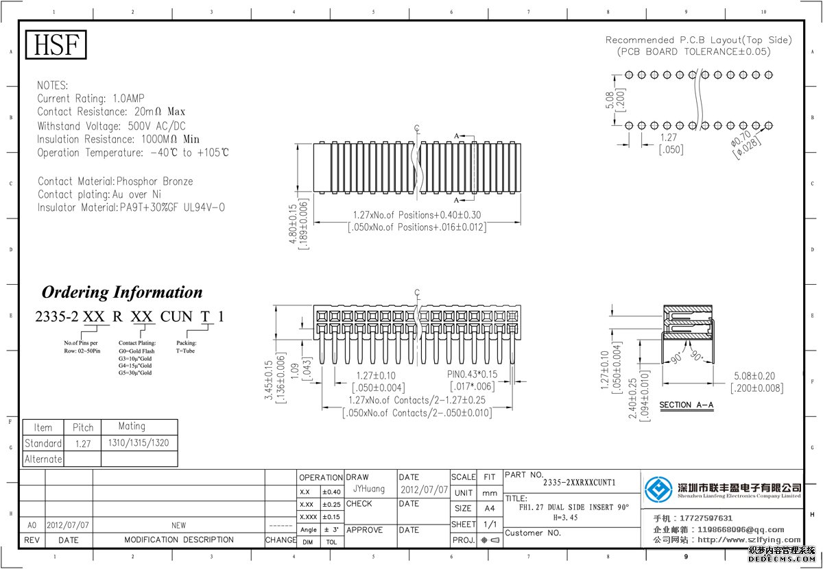 產(chǎn)品分類:排母連接器 產(chǎn)品規(guī)格:聯(lián)豐盈 1.27MM 雙排 180度SMT 側(cè)插型 排母 H=3.5 產(chǎn)品介紹:額定電流:1.0amp電流電阻:20m最大絕緣電阻:1000m民承受電壓:AC 500V /分鐘工作溫度:55﹣℃+