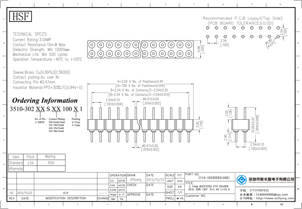 產(chǎn)品分類:圓孔排針排母連接器 產(chǎn)品型號:UL認(rèn)證 2.54MM 雙排 H=3.0 S/T 圓型排針 聯(lián)豐盈 技術(shù)參數(shù):額定電流:3.oamp接觸電阻:1om最大介電強(qiáng)度:MIN 1000vrms機(jī)械壽命:最少500次交配銷:0.