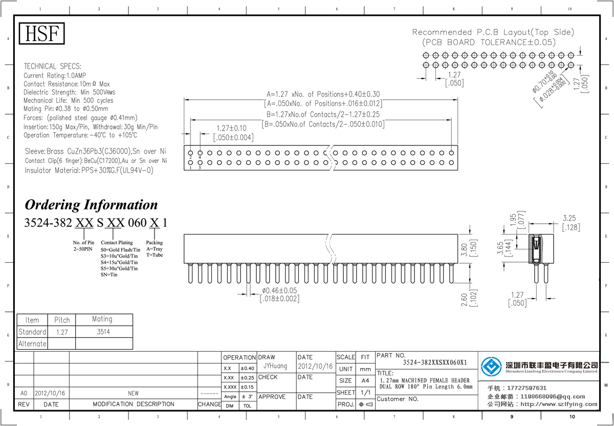 產品分類:圓孔排針排母連接器 產品型號:聯豐盈 1.27MM 雙排 圓孔排母 廠家 技術參數:額定電流:1.0amp接觸電阻:10m0 Max Dielectric強度:MIN 500vrm5機械壽命:最少500次交配銷:0.380.50mm力