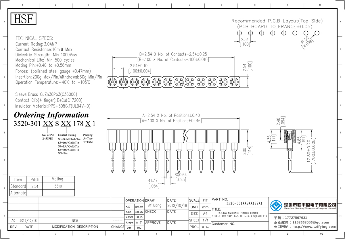 產品分類:圓孔排針排母連接器 產品型號:聯豐盈 2.54MM 單排 H=3.0 S/T 圓孔排母 技術參數:額定電流:3.oamp接觸電阻:1om最大介電強度:MIN 1000vrms機械壽命:最少500次交配引腳:0.70.9mm或