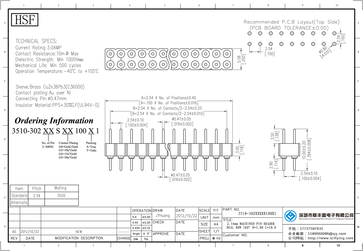 產(chǎn)品分類:圓孔排針排母連接器 產(chǎn)品型號:聯(lián)豐盈 2.54MM 雙排 H=3.0 S/T 圓型排針 技術參數(shù):額定電流:3.oamp接觸電阻:1om最大介電強度:MIN 1000vrms機械壽命:最少500次交配引腳:0.70.9mm或