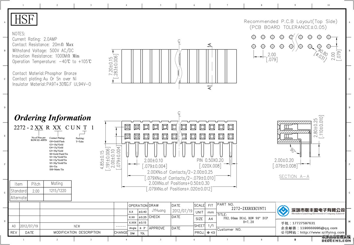 產(chǎn)品分類(lèi):排母連接器 產(chǎn)品規(guī)格:聯(lián)豐盈 2.0MM H=7.2MM 雙排 90DIP 排母 產(chǎn)品介紹:額定電流:3.0amp電流電阻:20m最大絕緣電阻:1000mmin耐壓:1000V AC /分鐘工作溫度:40﹣℃+ 105℃接觸材料: