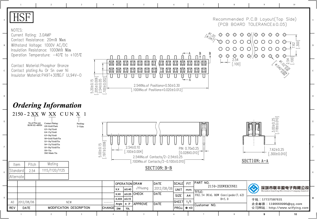 產品分類:排母連接器 產品規格:聯豐盈 2.54MM 雙排 蜈蚣腳 排母 供應 產品介紹:額定電流:3.0amp電流電阻:20m最大絕緣電阻:1000mmin耐壓:1000V AC /分鐘工作溫度:40﹣℃+ 105℃接觸材