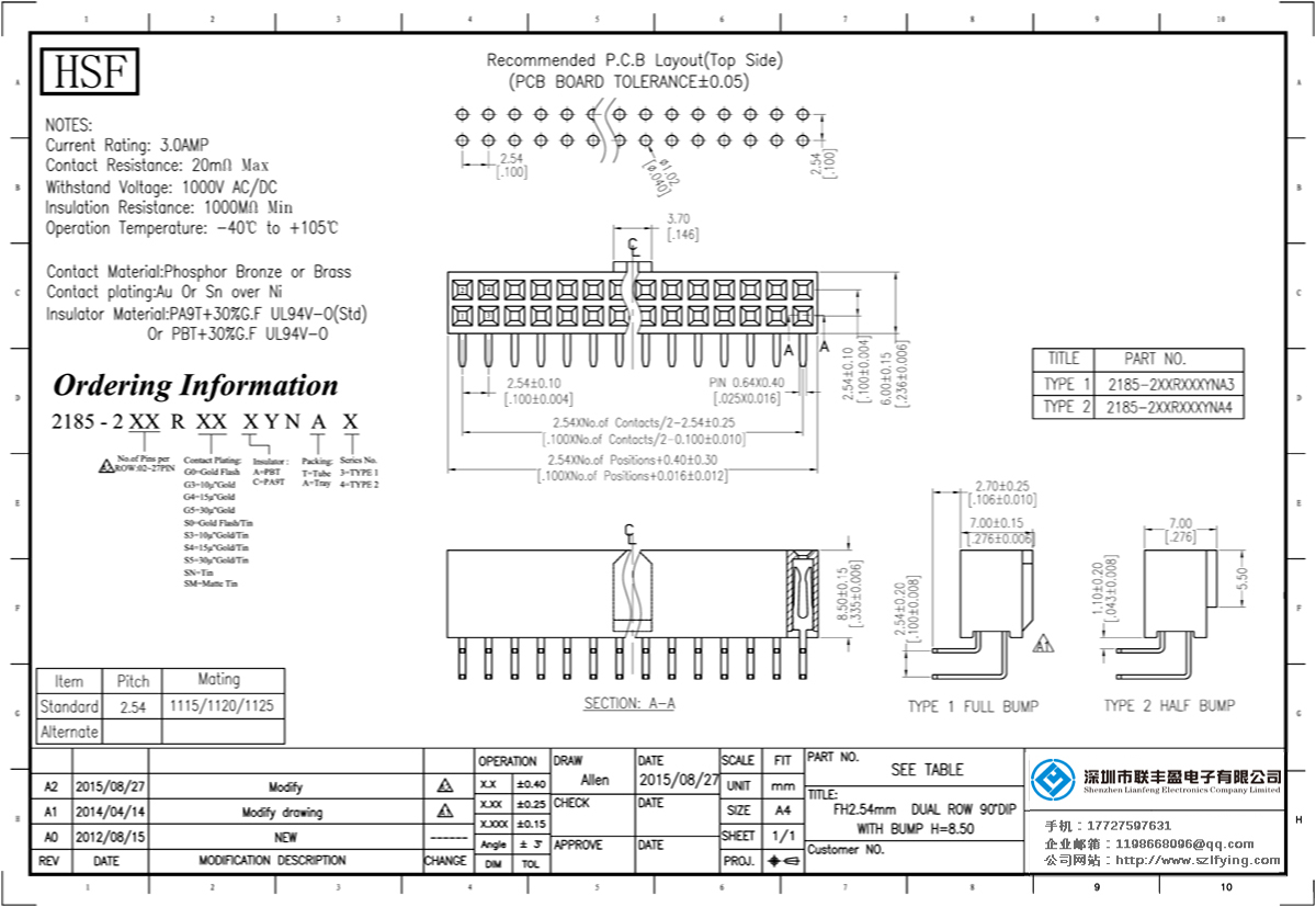 產(chǎn)品分類:排母連接器 產(chǎn)品規(guī)格:2.54MM H=8.5MM 帶凸點(diǎn) 雙排 90彎插型 排母 產(chǎn)品介紹:額定電流:3.0amp電流電阻:20m最大絕緣電阻:1000mmin耐壓:1000V AC /分鐘工作溫度:40﹣℃+ 105℃接觸