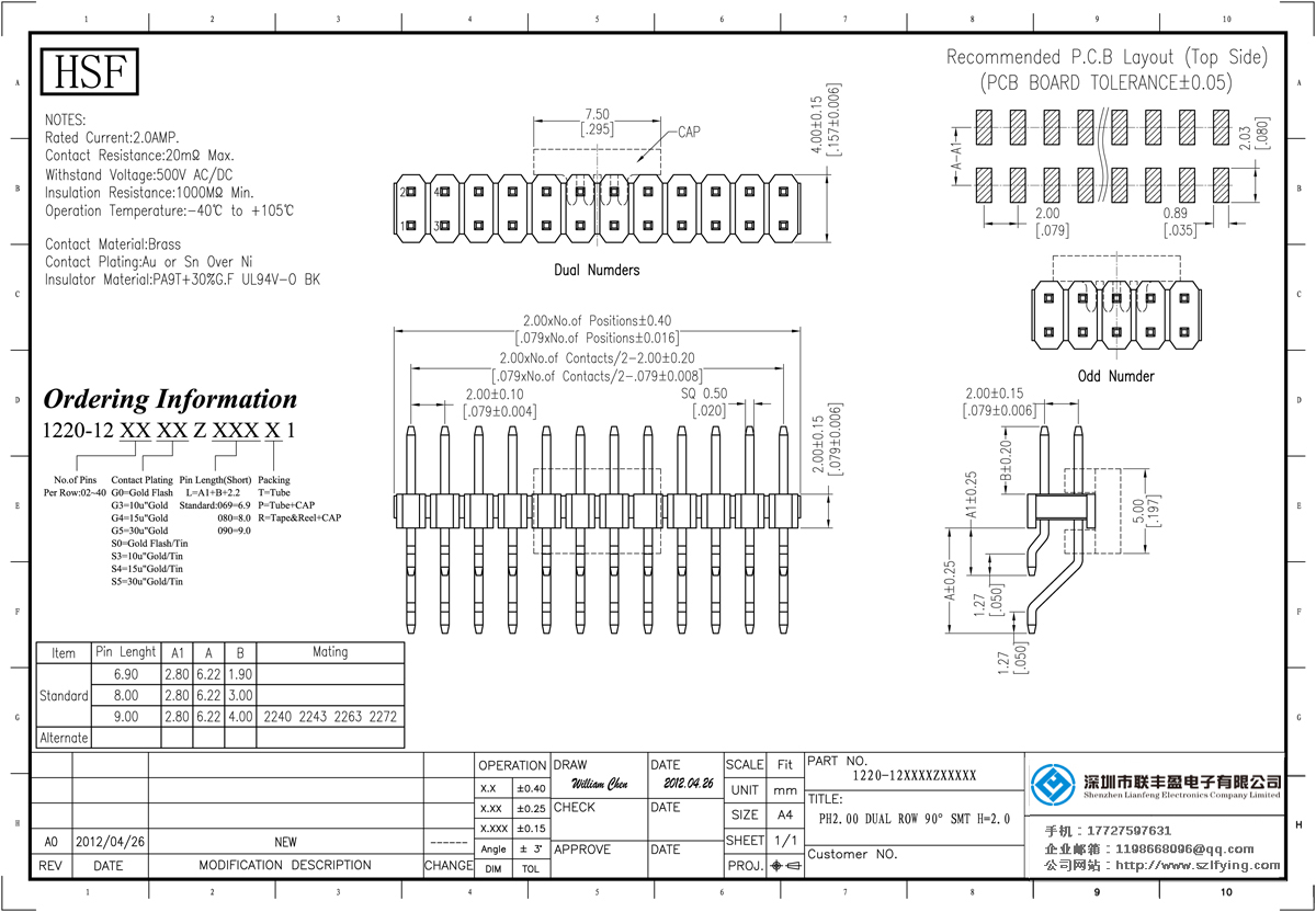 產(chǎn)品分類:排針連接器 產(chǎn)品規(guī)格:聯(lián)豐盈 2.0MM 雙排 90SMT 排針 供應(yīng) 產(chǎn)品介紹:額定電流:2.0amp電流電阻:20m最大絕緣電阻:1000m民承受電壓:AC 500V /分鐘工作溫度:40﹣℃+ 105℃接觸材