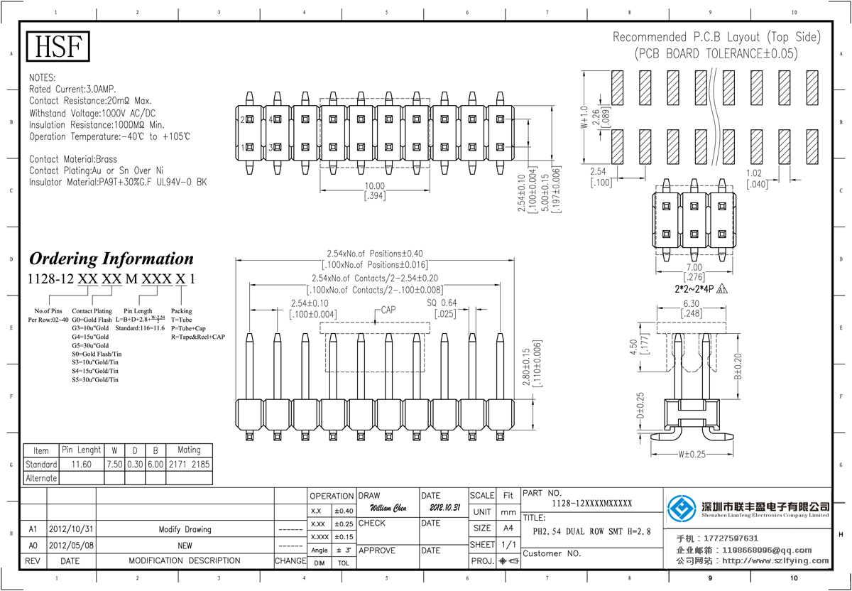 產品分類:排針連接器 產品規格:2.5MM 單層雙排 180SMT排針 聯豐盈 產品介紹:額定電流:2.0amp電流電阻:20m最大絕緣電阻:1000m民承受電壓:AC 500V /分鐘工作溫度:40﹣℃+ 105℃接觸材料