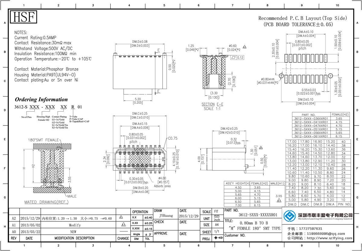 產品分類:Board To Board 連接器 產品型號:0.8MM 母座 單槽結構 Board To Board聯(lián)豐盈 技術參數:額定電流:0.5amp電流電阻:20m最大絕緣電阻:100m承受電壓:AC 500V /分鐘工作溫度:20﹣℃+ 1