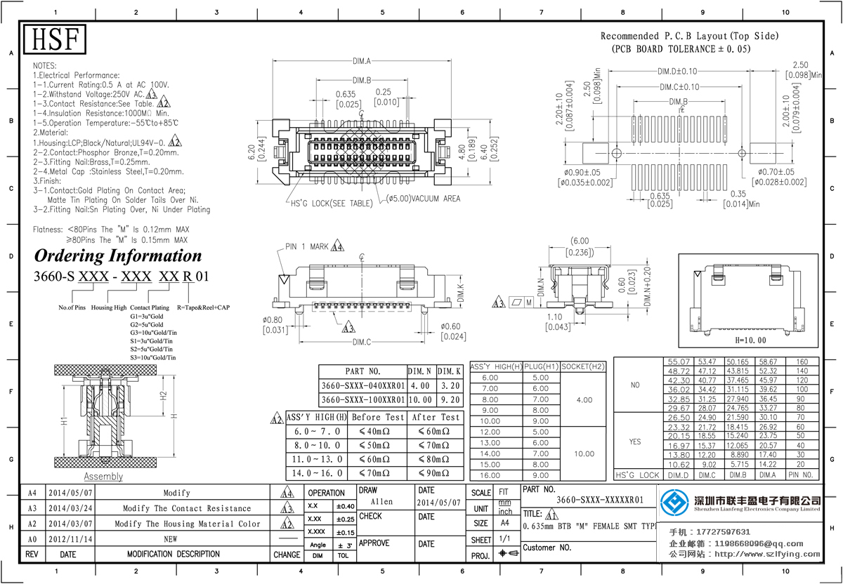 產品分類:Board To Board 連接器 產品型號:0.635MM 40P 母座 Board To Board 聯豐盈 技術參數:額定電流:0.5amp電流電阻:60m最大絕緣電阻:100m承受電壓:AC 500V /分鐘工作溫度:40﹣℃+ 105℃接