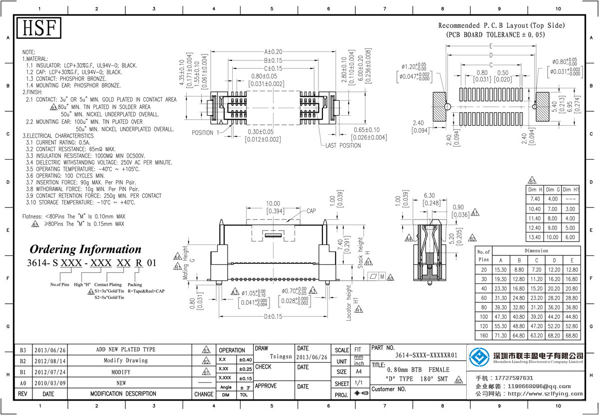 產品分類:Board To Board 連接器 產品型號:0.8間距 母座 單槽結構D型 Board To Board 連接器 技術參數:額定電流:0.5amp電流電阻:65m最大絕緣電阻:1000m承受電壓:交流250V /分鐘工作溫度: