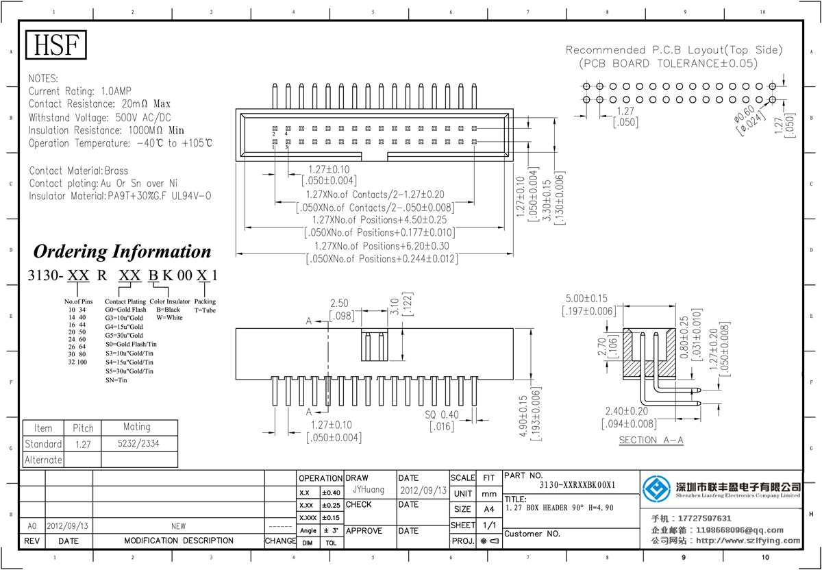產品分類:簡易牛角連接器 產品型號:聯豐盈 抗氧化 1.27MM H=5.7 90DIP ,滿PIN 簡牛 廠家 技術參數:額定電流:1.0amp電流電阻:20m最大絕緣電阻:1000m民承受電壓:AC 500V /分鐘工作溫度: